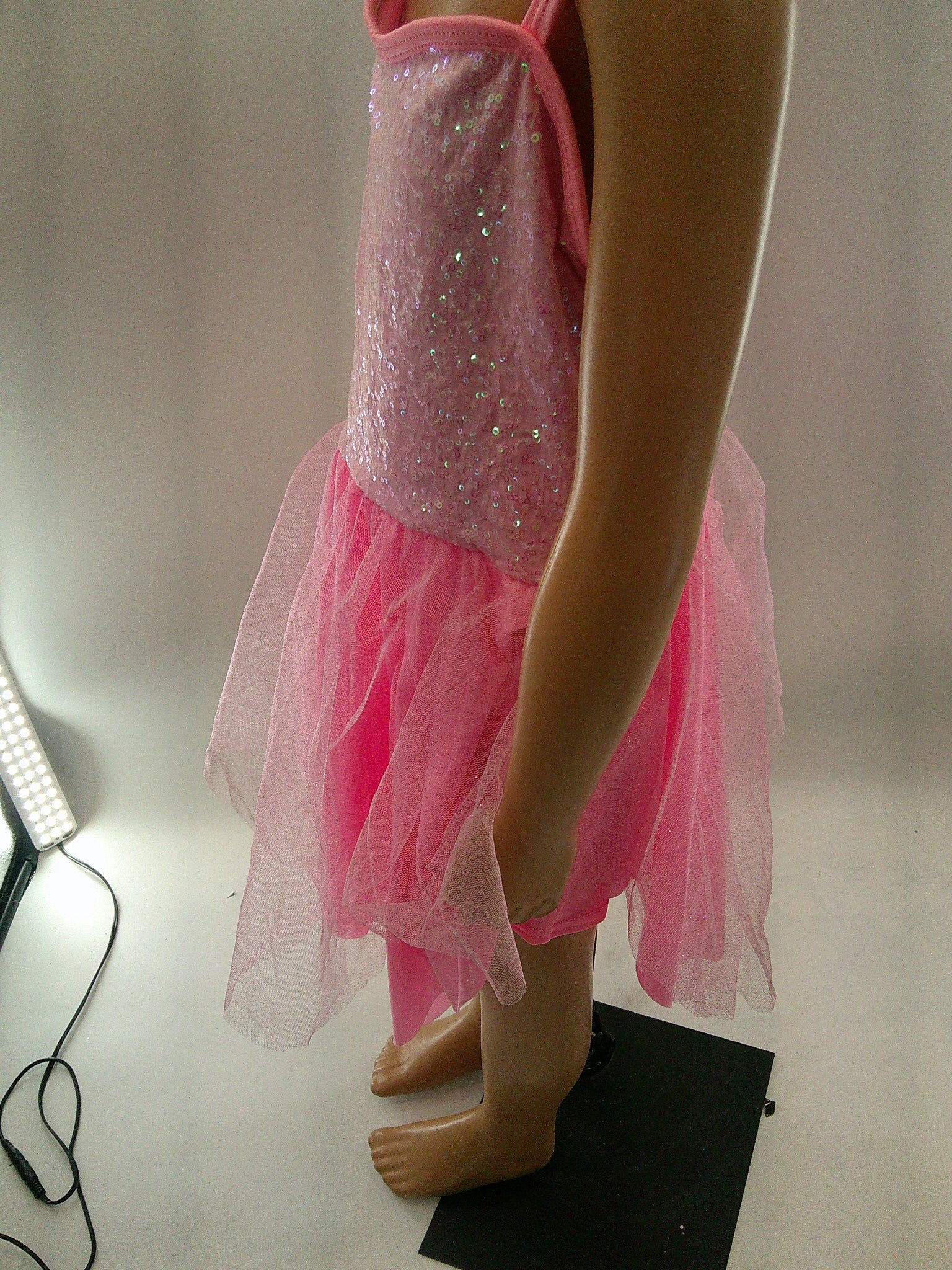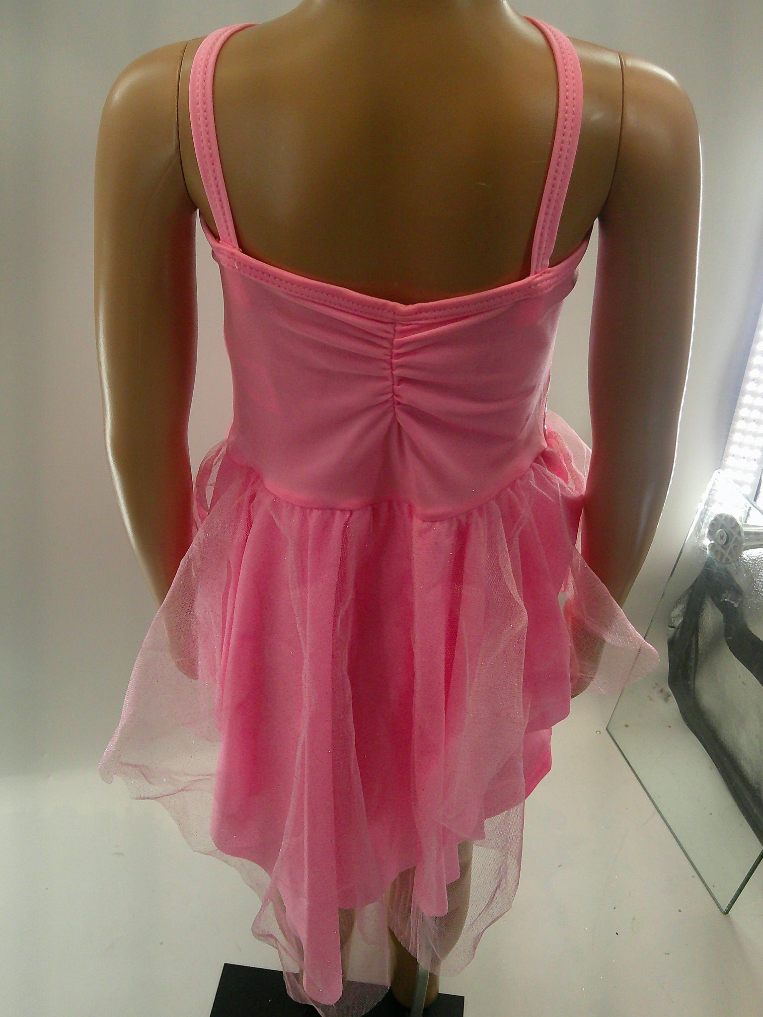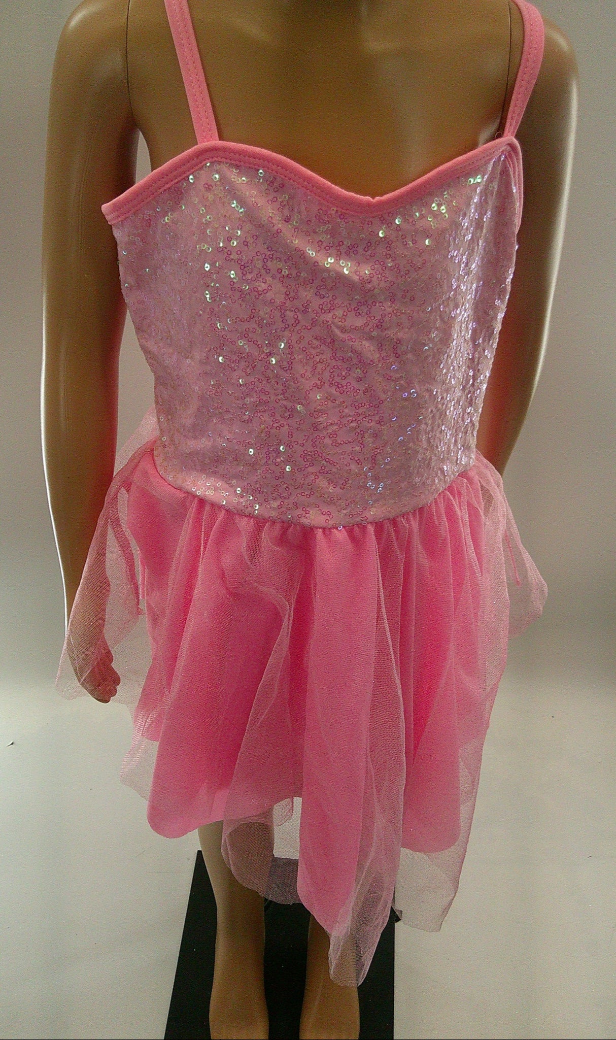 Detailed Description: Sequined biketard with attached glitter tulle tutu. Cami straps are not adjustable.