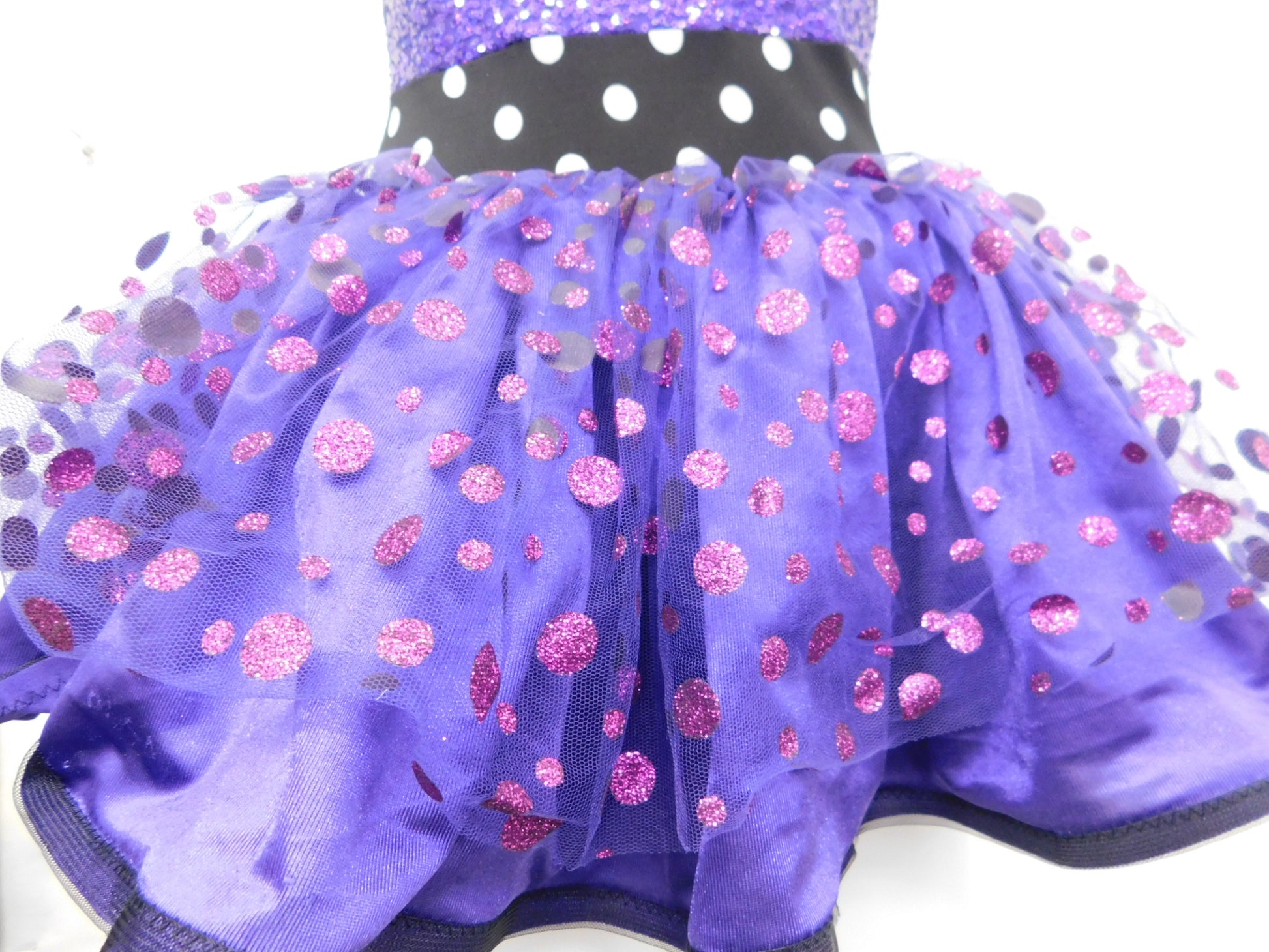 Detailed Description: Sequin pinch bodice with tank straps. Polka dot waistband. Attached skirt with a tulle overlay with big glitter dots on tulle.
