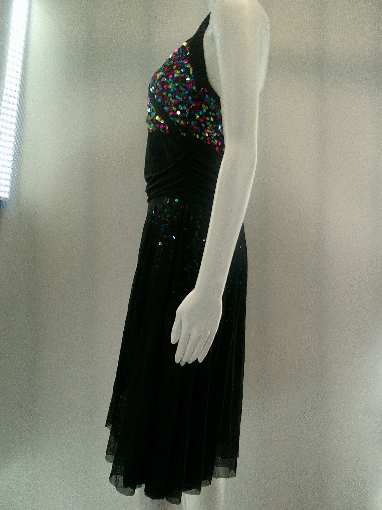 Detailed Description: Sequined unitard with attached flowy skirt, halter neck connects behind the neck.