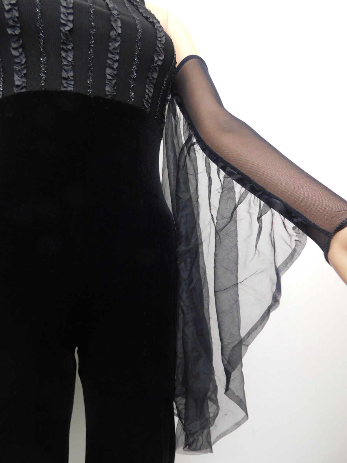 Black velour unitard with attached straps. Top of unitard has mesh overlay with ruffle and sparkle stripes. The pack of the unitard is see through mesh. Arm accessories the resemble wings are included.