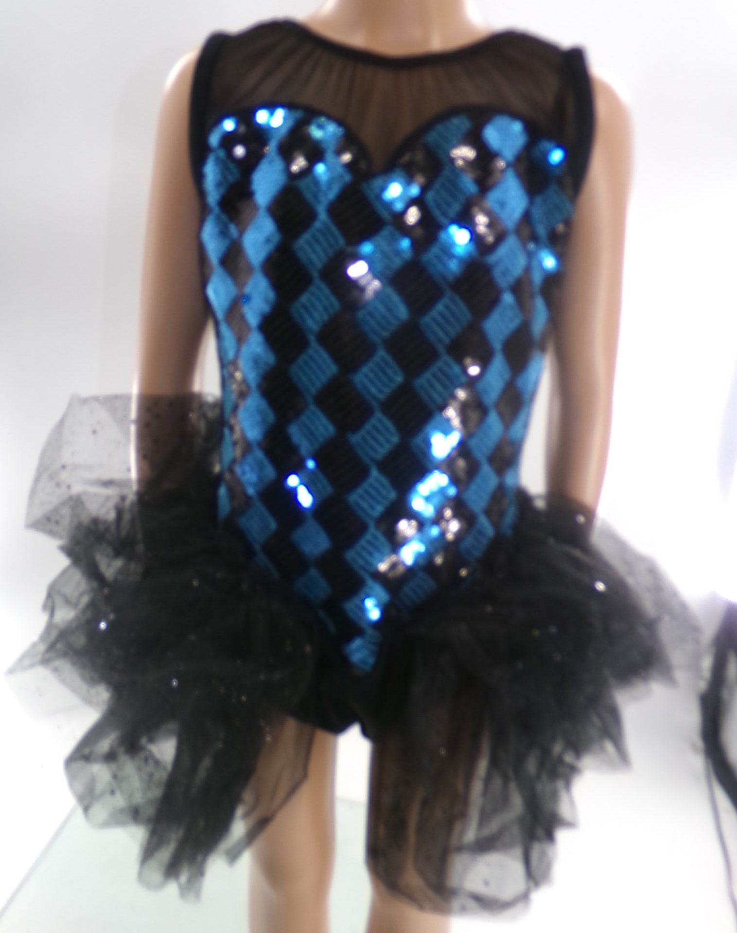 Detailed Description: Geometric patterned leotard with attached tulle backskirt.