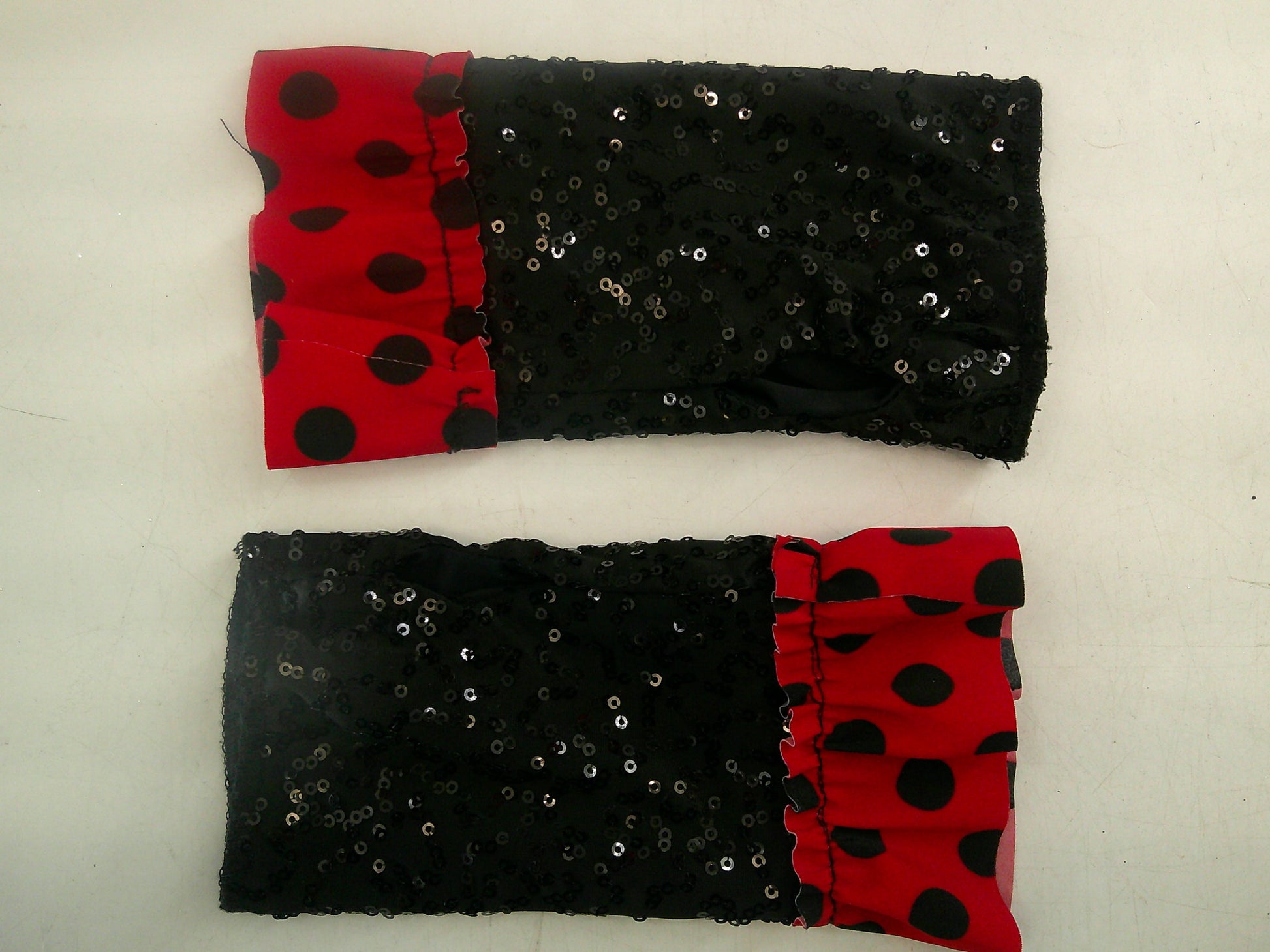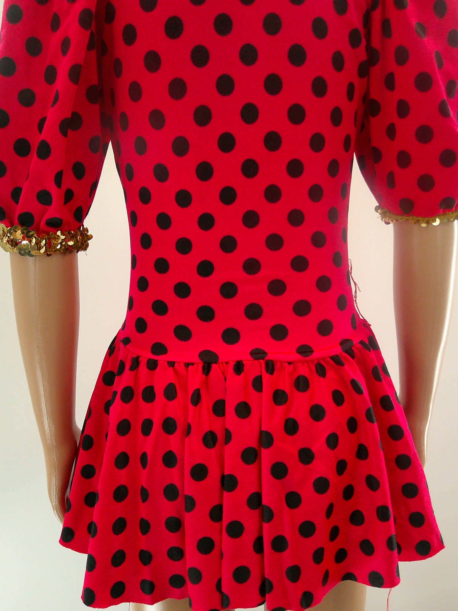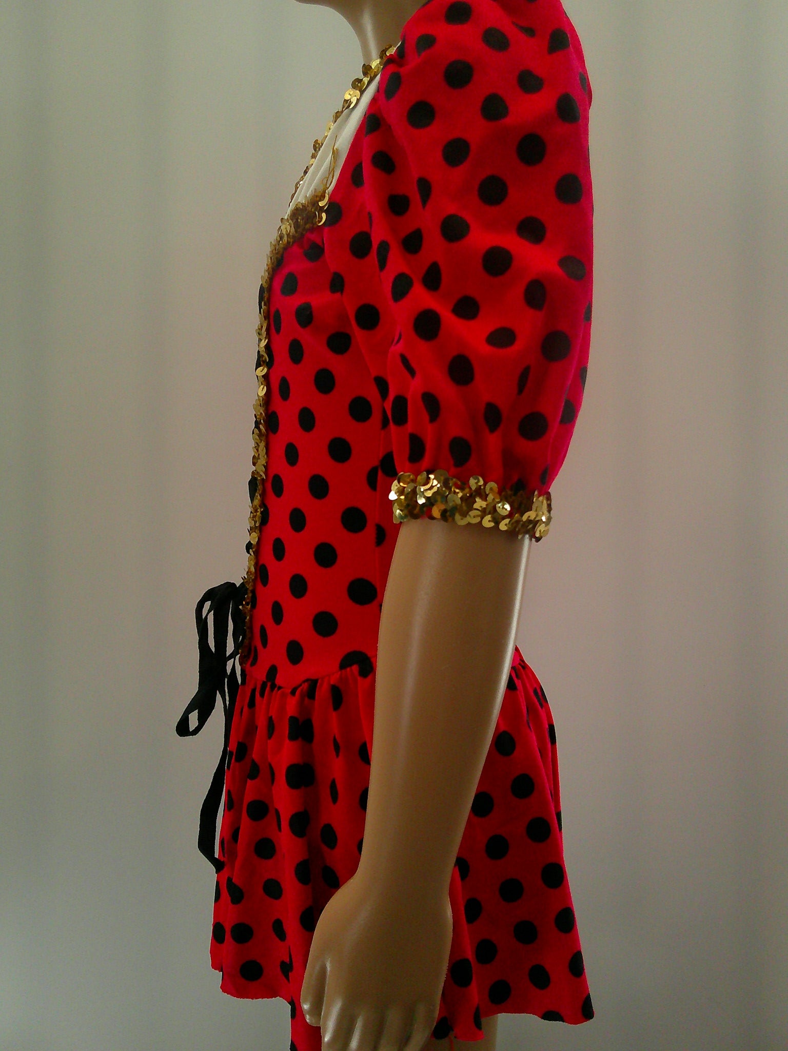 Detailed Description: Polka dotted dress with corset like detain along the front and sequin trim. Matching arm mitts included.