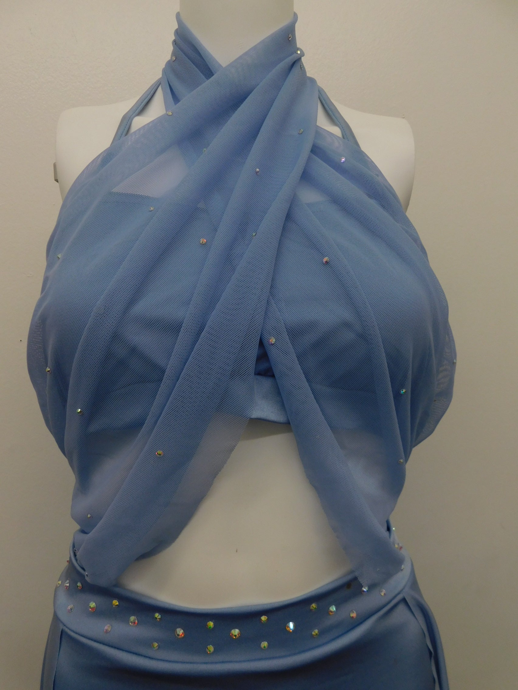 Lycra and stretch mesh crisscross halter dress with snap closure and front lined bra. Lycra open front skirt with fully lined trunks.