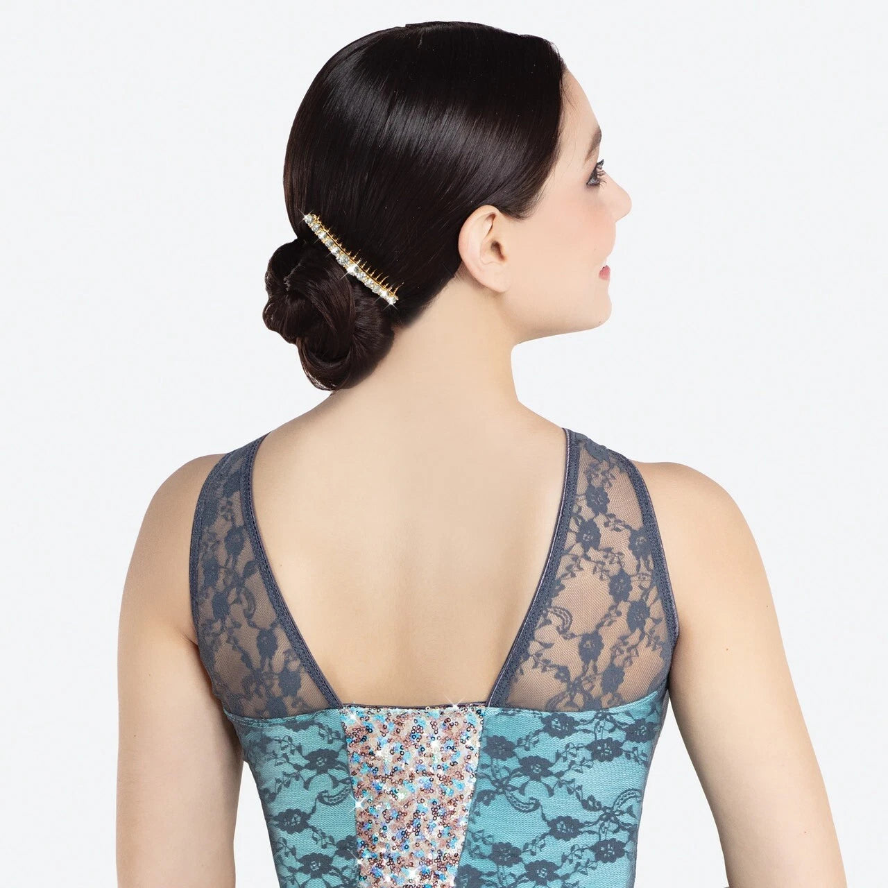 Spandex leotard with matching trunks has a floral lace overlay and features lined sequin spandex insets. Attached skirt has layers of tulle under a floral lace peplum. DOES NOT Include rhinestone comb