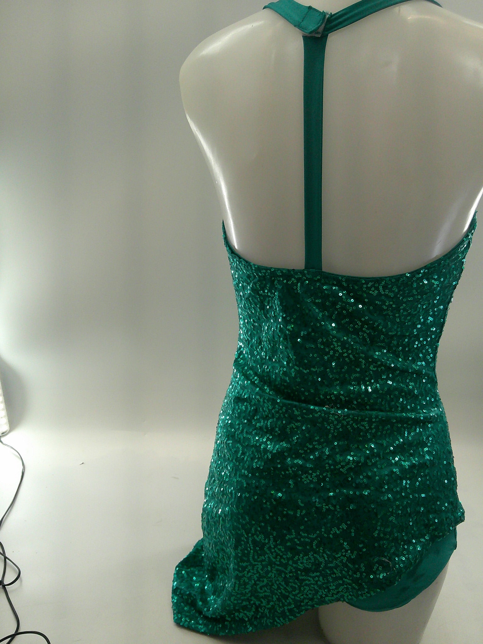 Detailed Description: Sequined asymmetrical dress with attached trunks, velco to fasten behind neck.