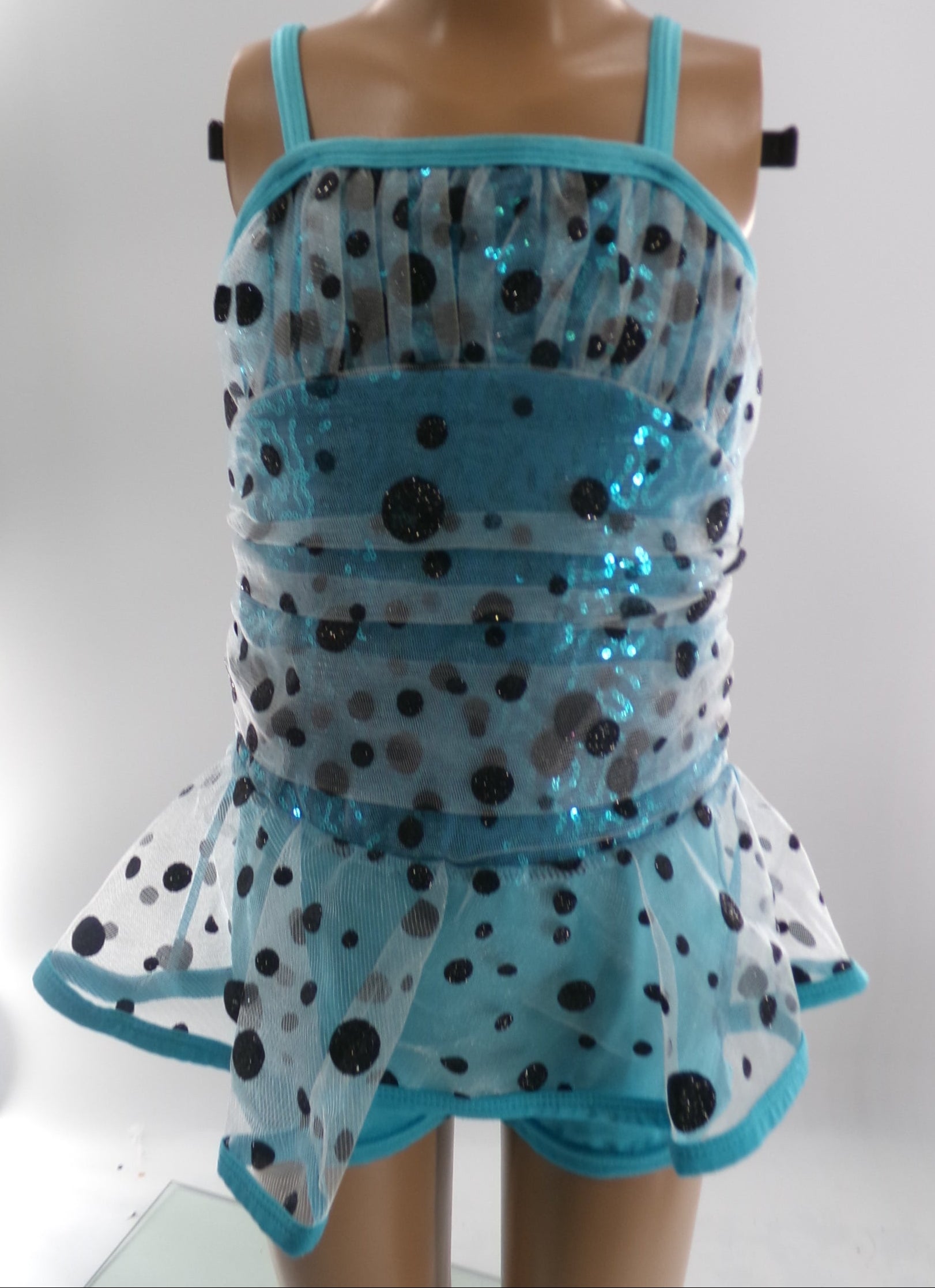 Detailed Description: Polka dotted sequined biketard with attached skirt.