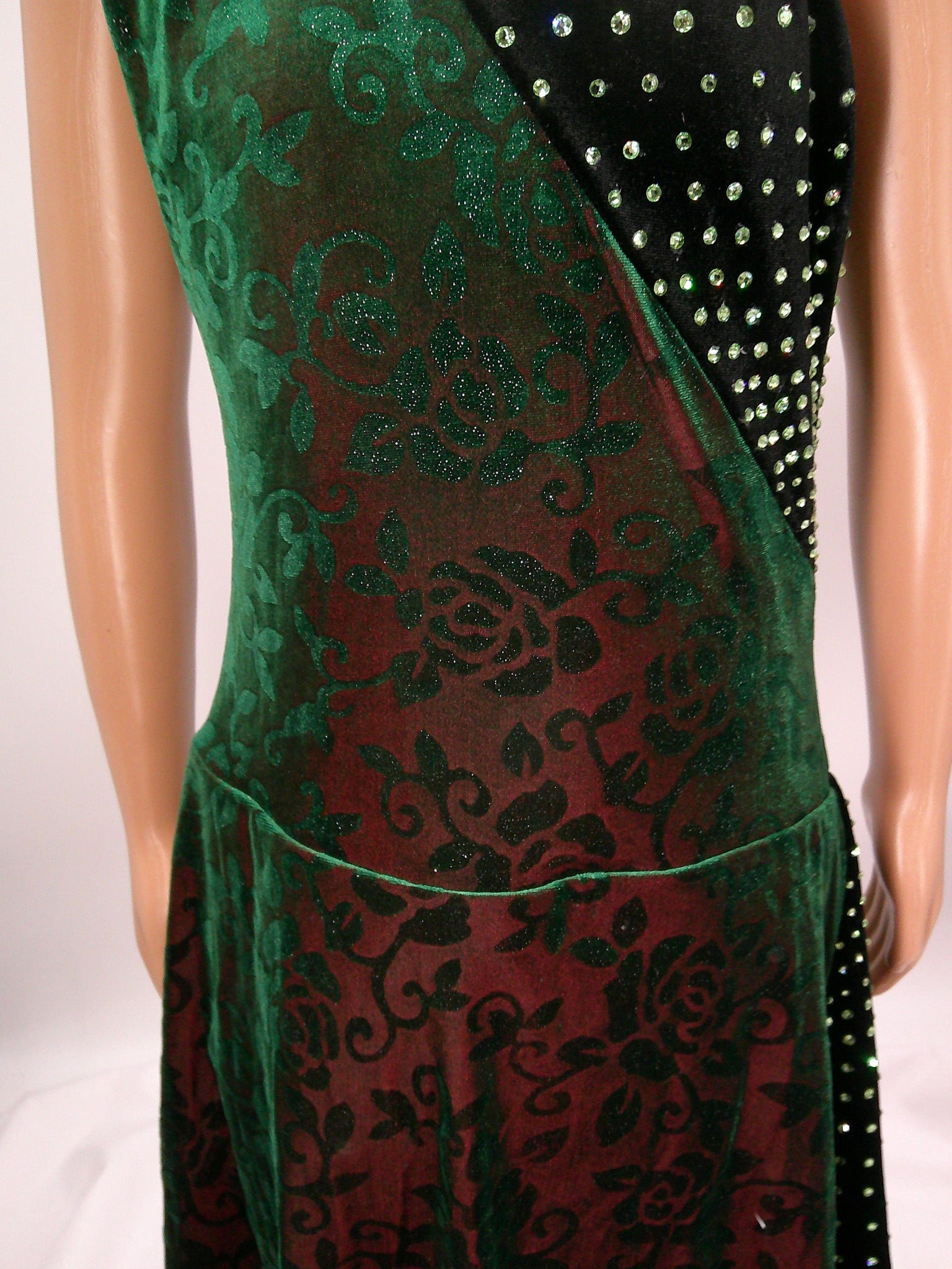 Velvet leotard with attached asymmetrical skirt. Glittered floral designs on leotard and rhinestones all over left side of costume. Gorgeous ice skating costume