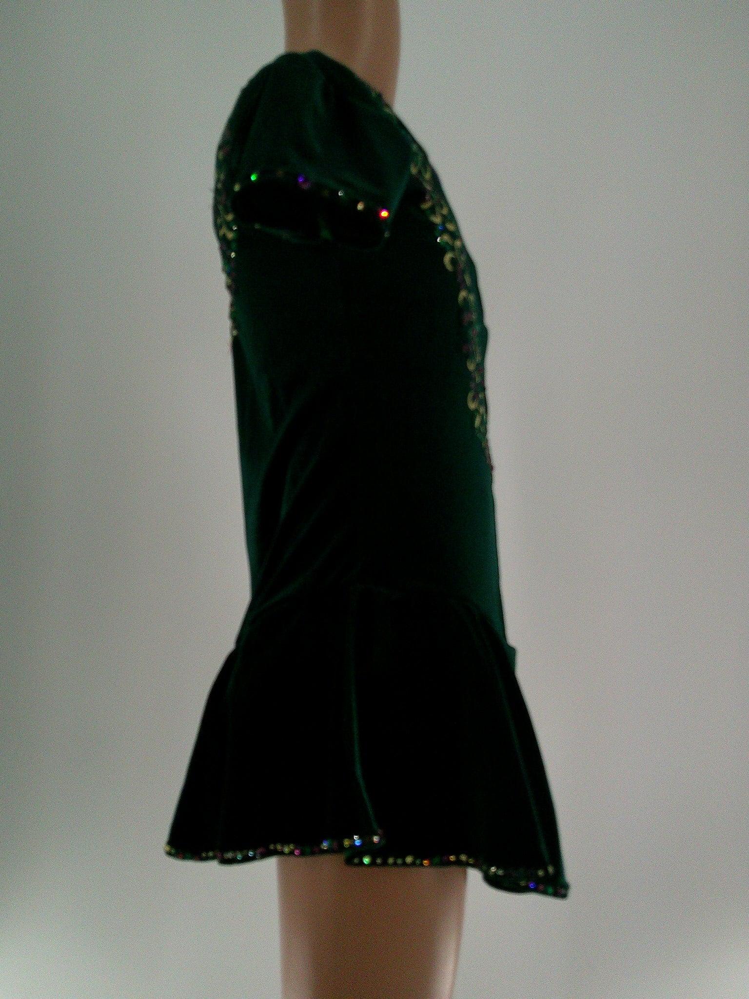 Velvet costume with attached skirt. Beautiful embroidery and rhinestones decorate this stunning custom costume. Perfect for irish dance or ice skating.