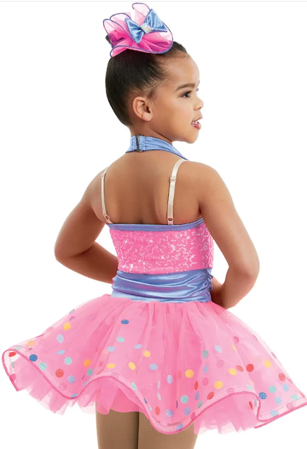 Skirt is made of bubblegum dot mesh with crinoline trim over tricot.