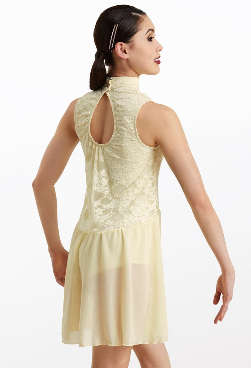 Baby doll-style dress has a stretch lace bodice with scalloped lace trim Georgette skirt Mock neck collar has snaps at the neck Keyhole openings in both the front and back Attached matte nylon/spandex leotard Glitter free! RHINESTONES added for extra sparkle.