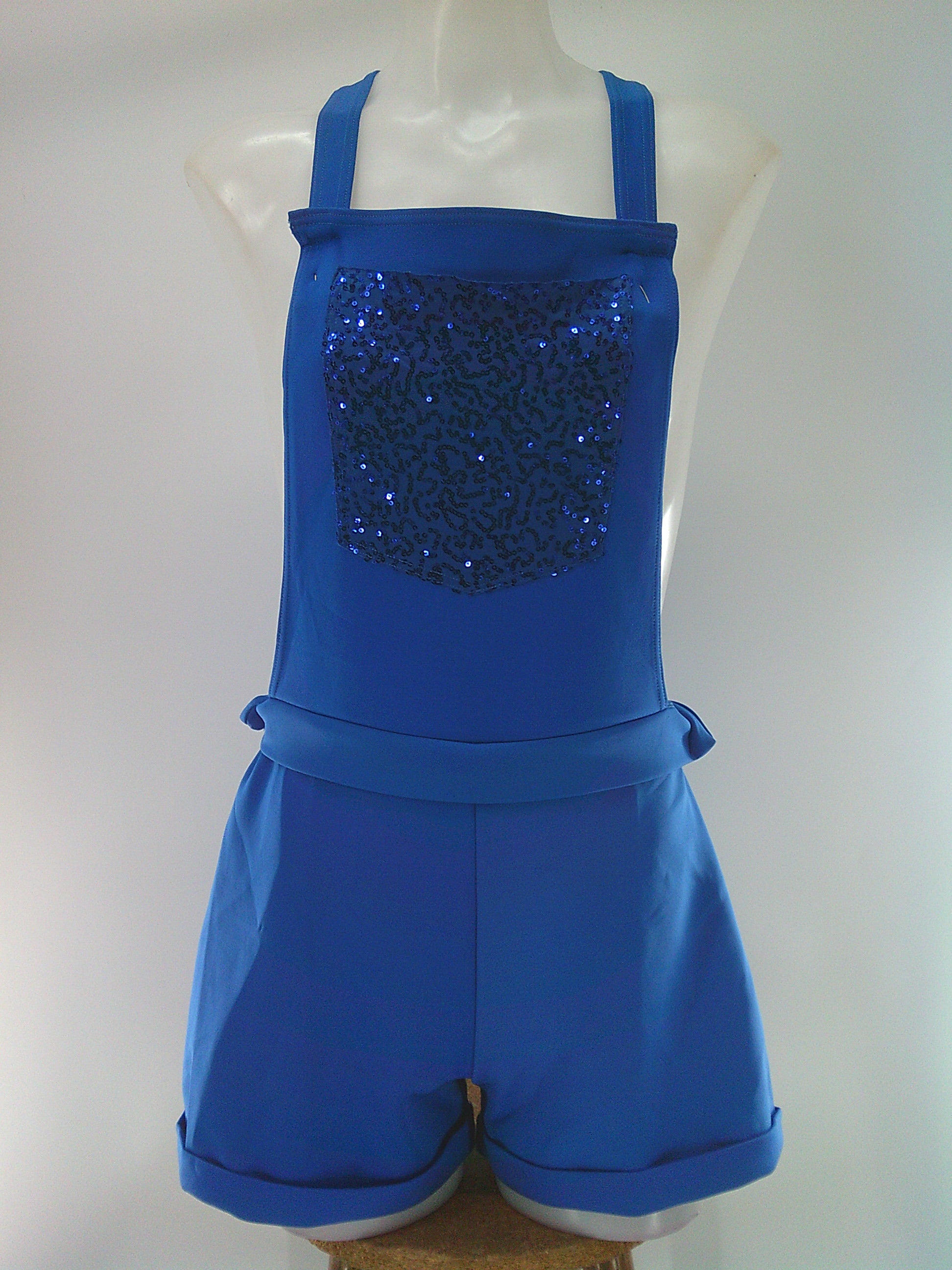 Short overalls have a sequin spandex front pocket