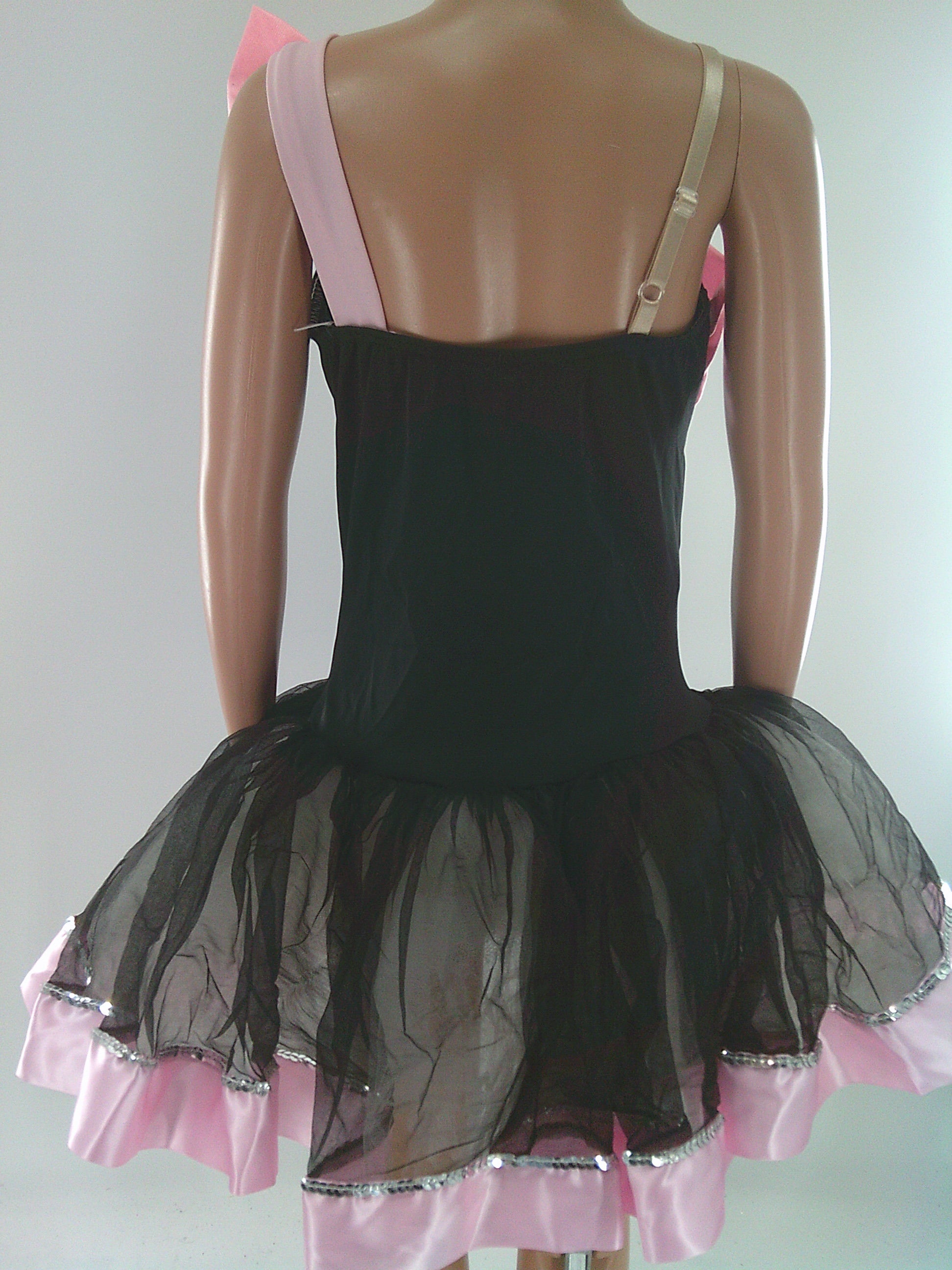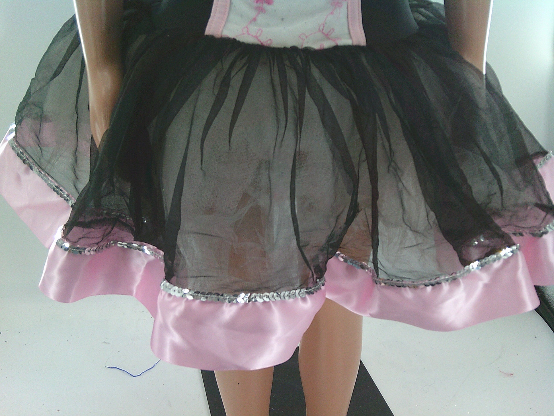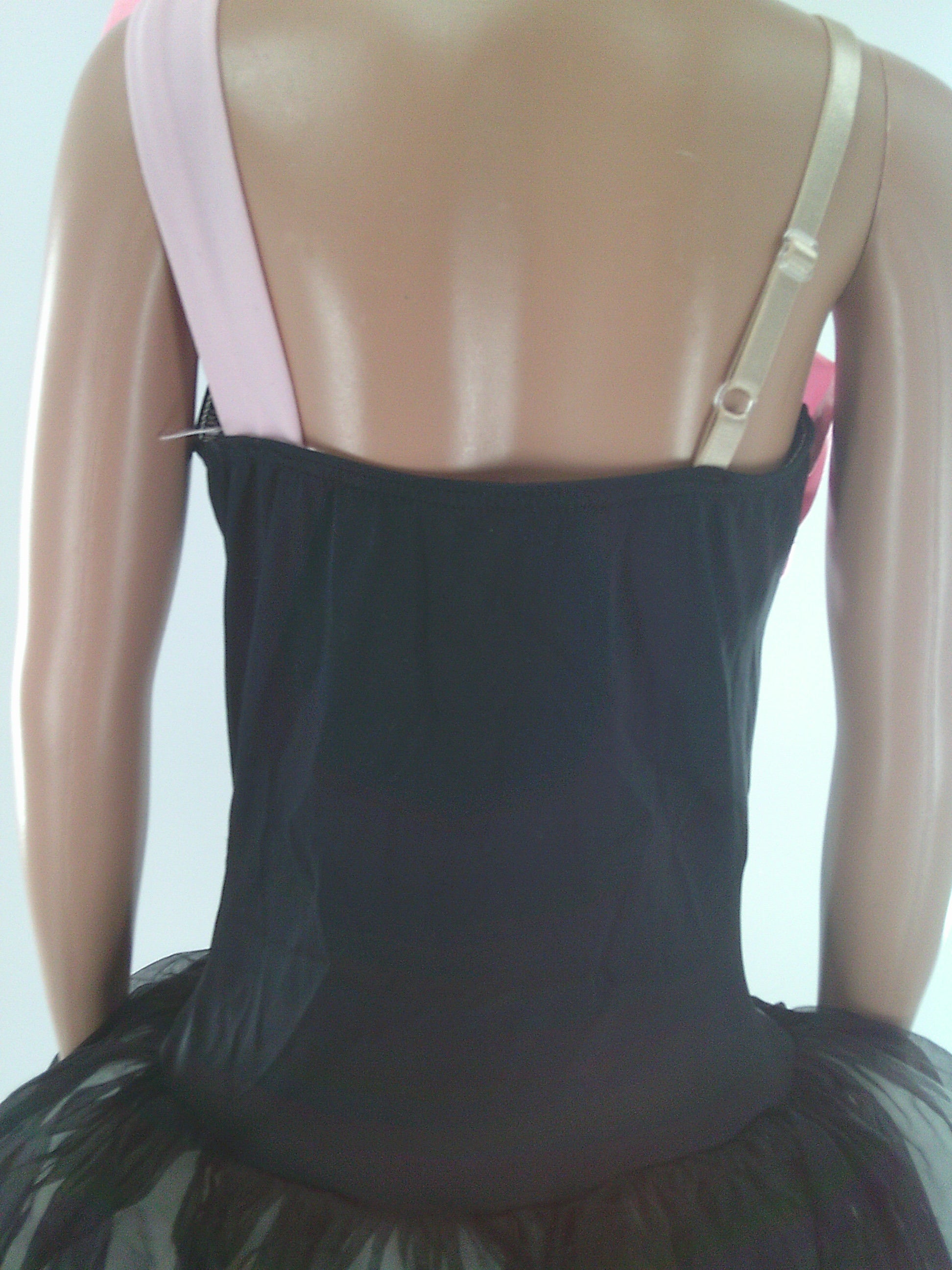 Spandex leotard with mesh and lace inset along the middle of the bodice. Attached tutu with sequined lining. One strap is adjustable.