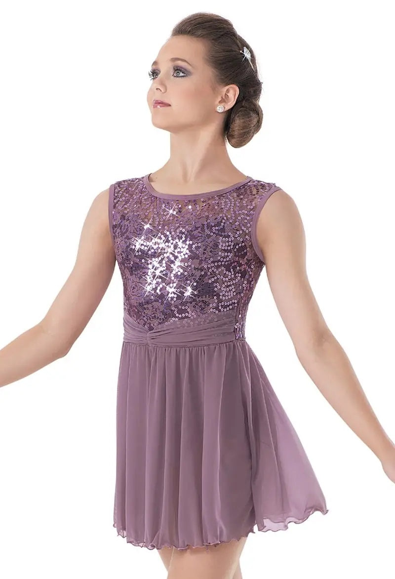 This simple, flowing design invites dancers to be at their expressive best. The matte nylon/spandex bodice has a shimmering sequin stretch-lace overlay. The cummerbund and gathered skirt with fluted hem are stretch power mesh. Color-match binding softly covers the neck and arm openings. Closes with a back zipper. Nylon/spandex trunks are attached. Imported. DOES NOT Include : Large rhinestone barrette.