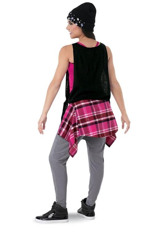 This hip-hop costume features a black, open side-tie tank layered over a lipstick camisole top and paired with gray matte jersey harem pants. Customize the look with a plaid flannel button-down shirt tied around your waist or worn over the tank.