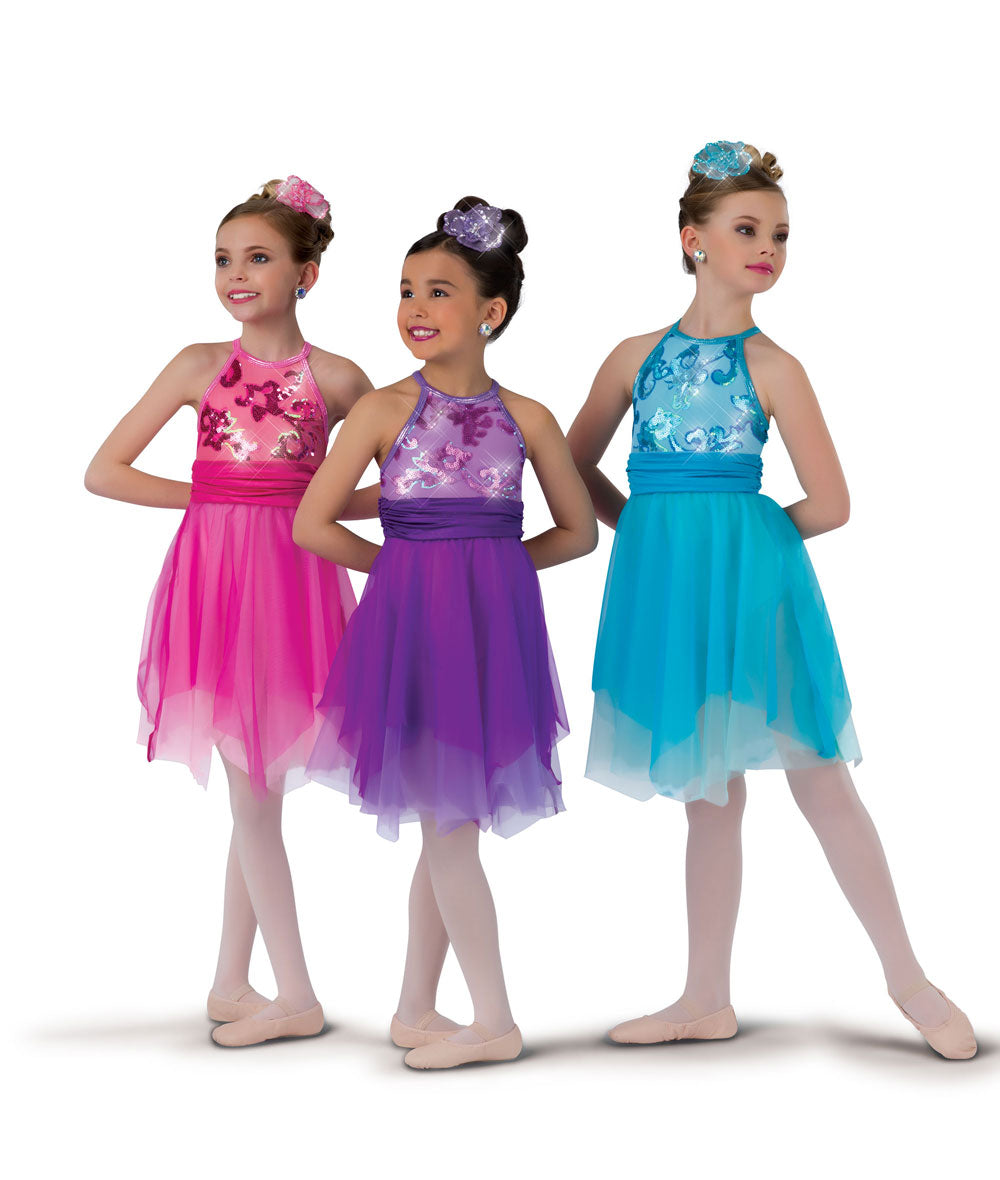 Lined filigree sequin mesh and chiffon dress with shimmer slinky waistband and attached spandex leotard. Made in the USA.