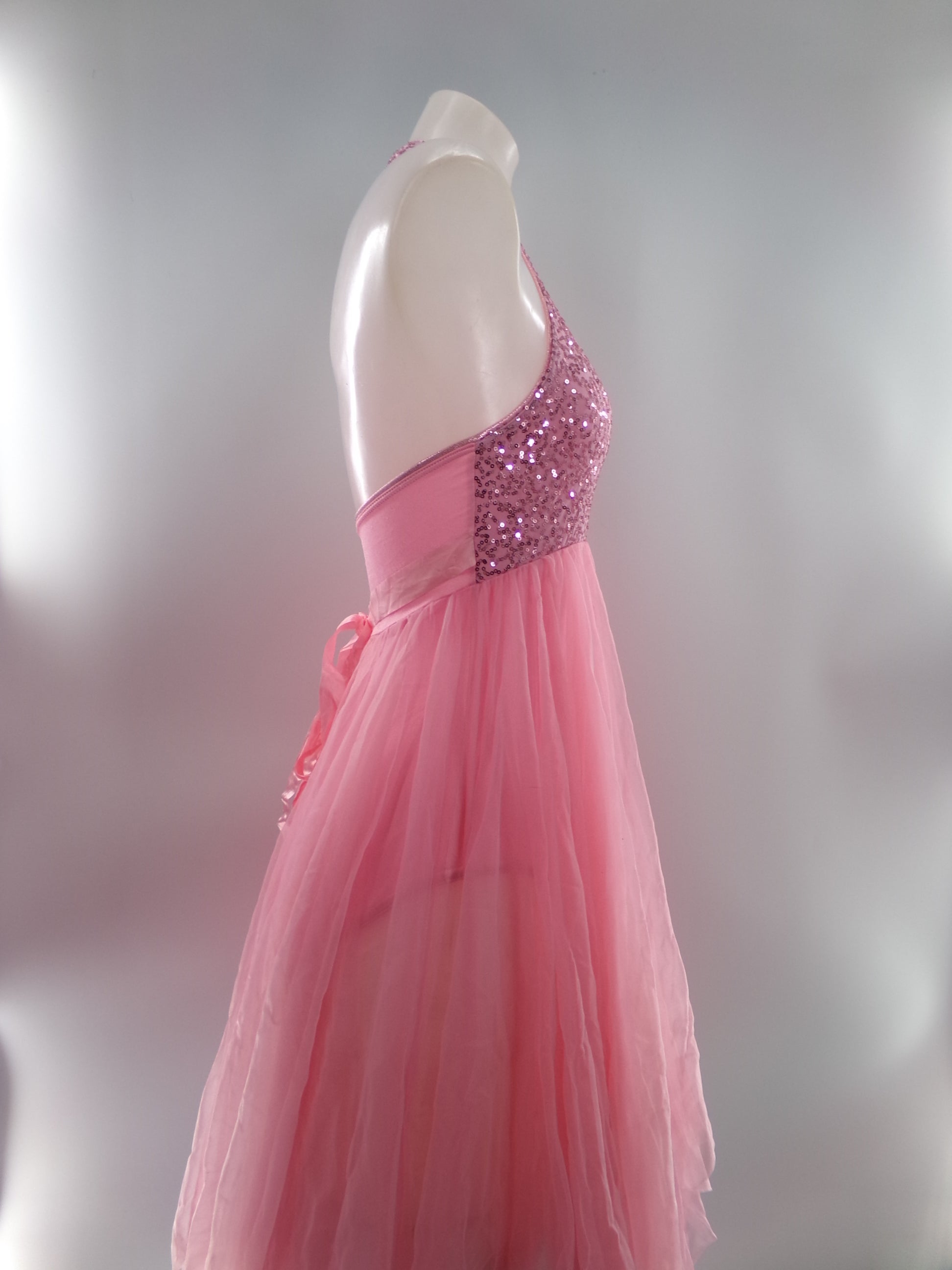 Detailed Description: Sequined bodice leotard with attached long, flowy skirt. Halter neck