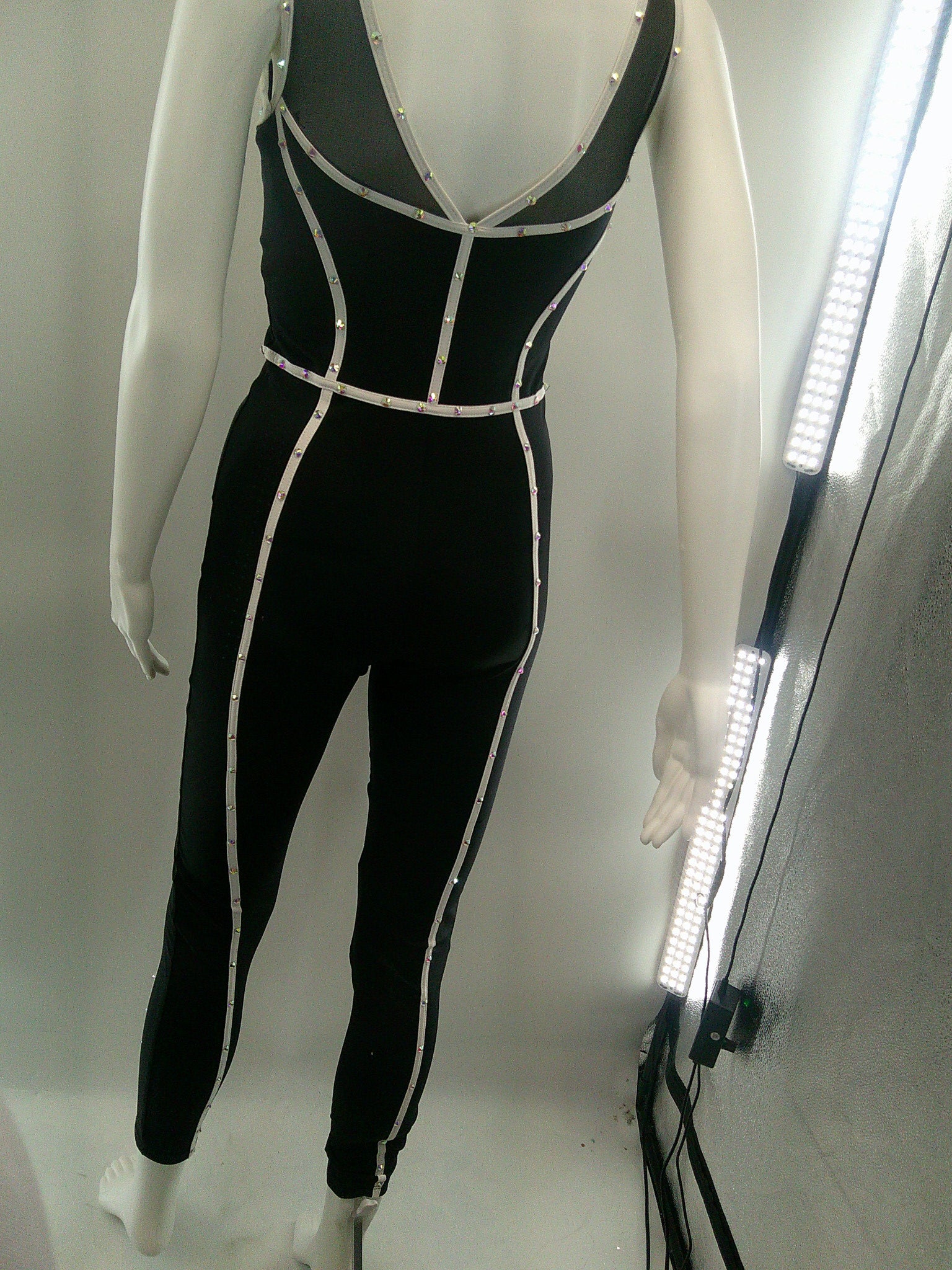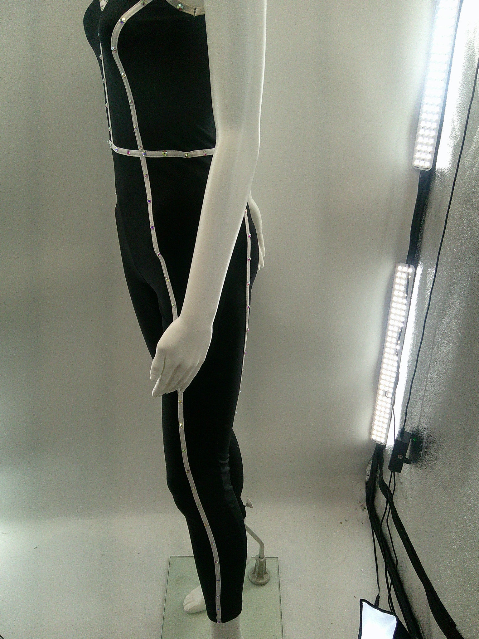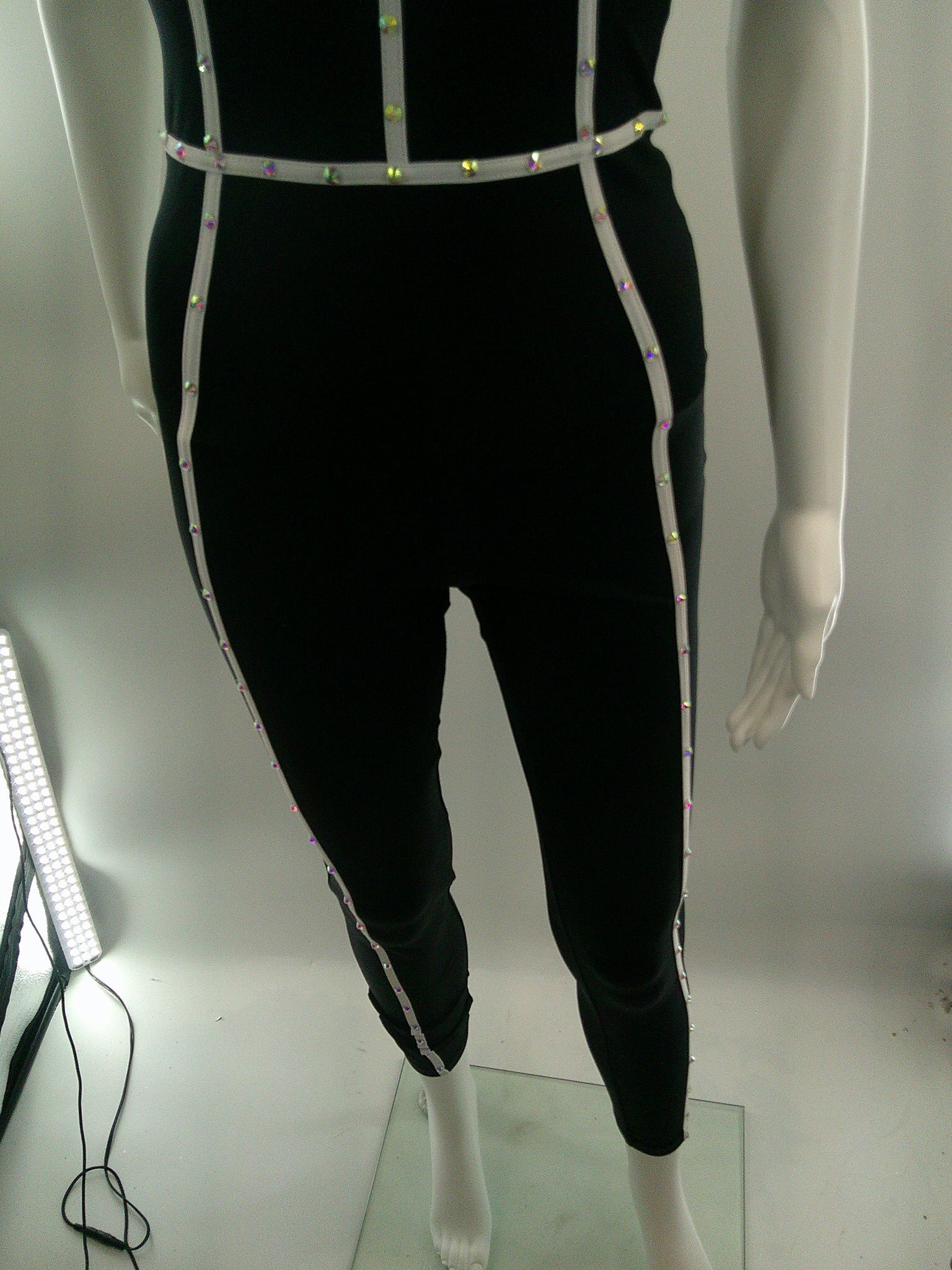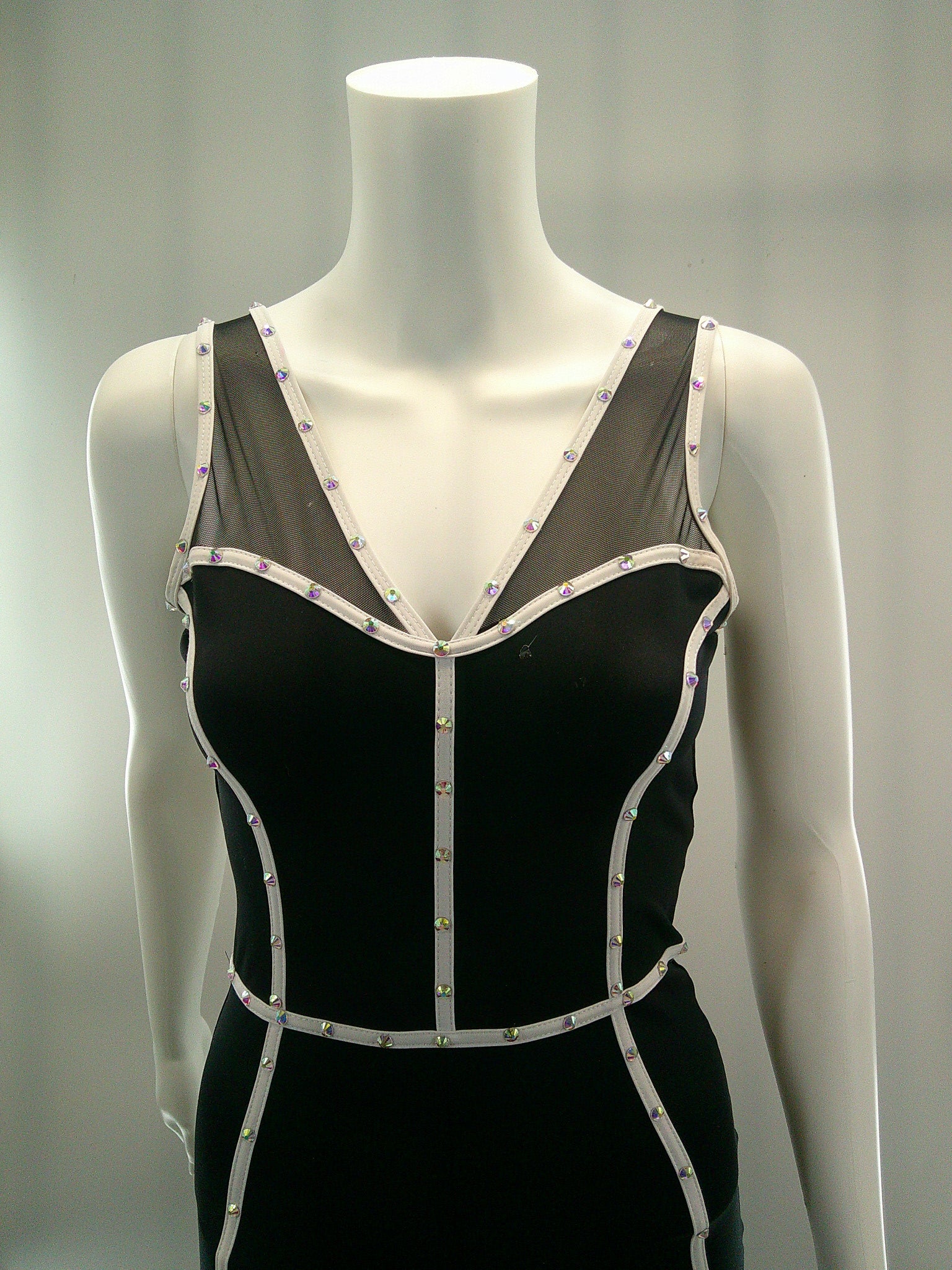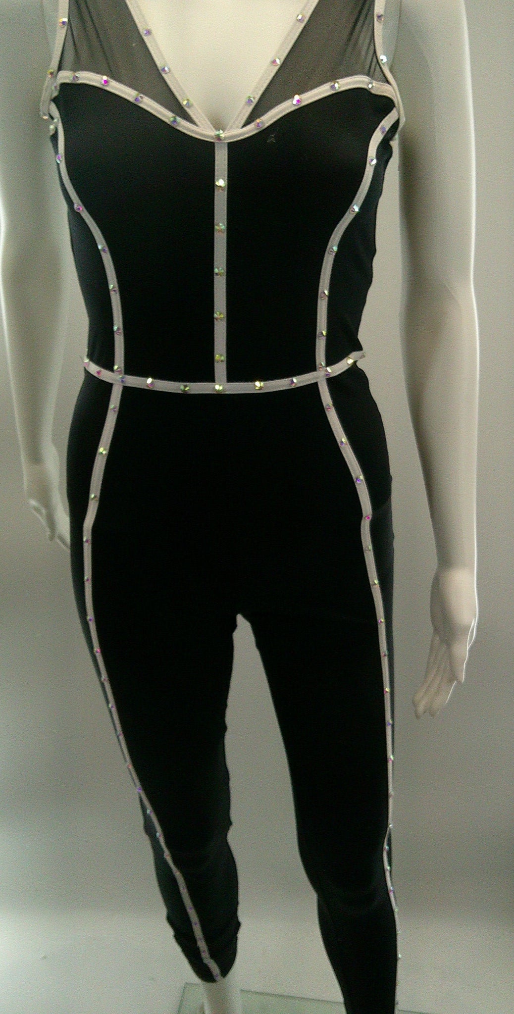Detailed Description: Unitard with mesh straps and white trim. Rhinestones added along the trim.