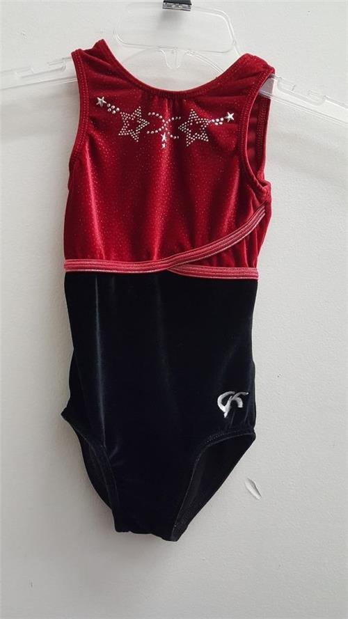 Brand: GK Elite Size: Small Child Colors: Red Black Great For: Acro Tumbling Gymnastics Dance Features: Racer Back Lycra Tank Leotard Color Block - Racer Back and Stones