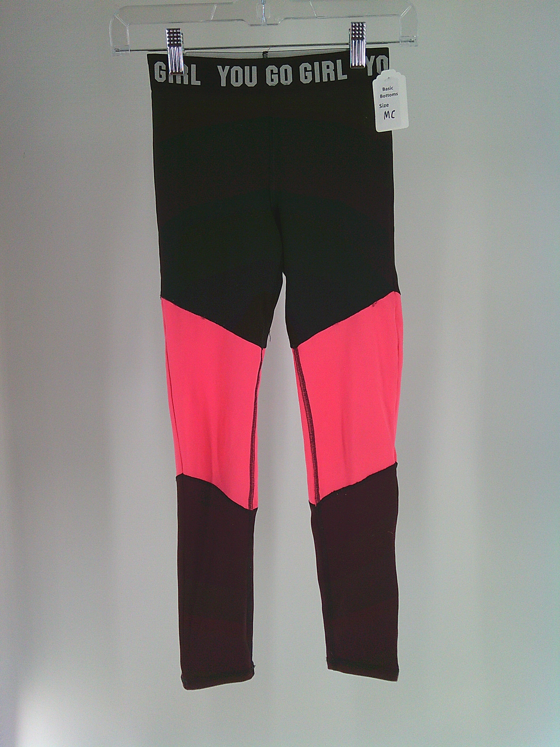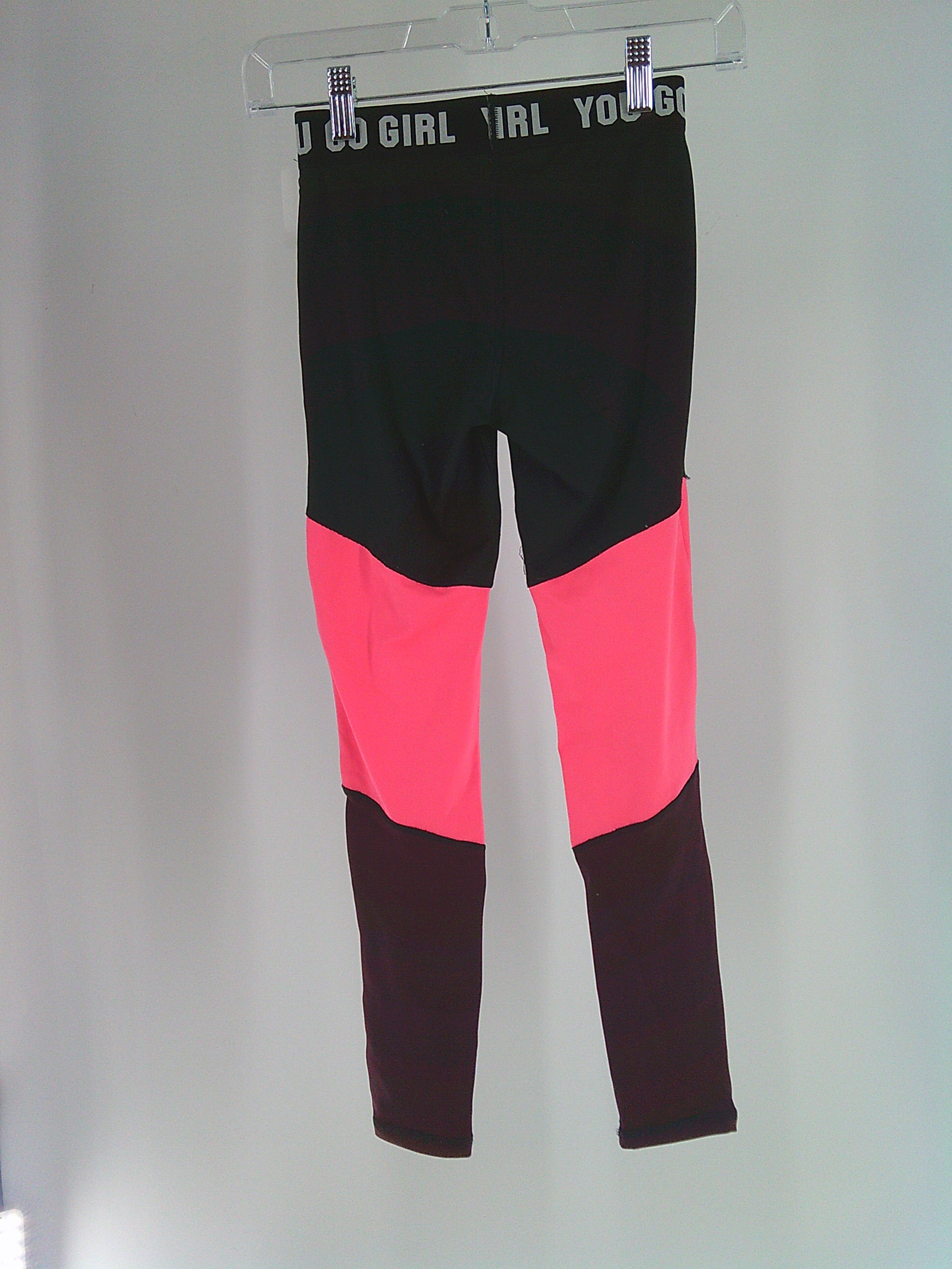 Leggings with Elastic waist that has You go Girl printed on it and has Pink/Burgundy Color Block Legs