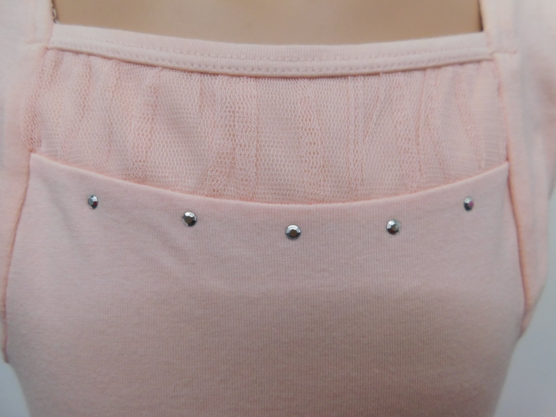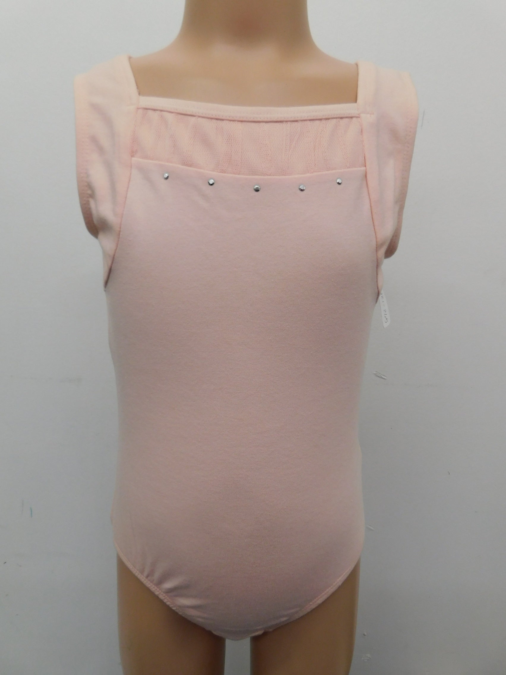 Features: Pink tank leotard with mesh layer and jeweled detailing along neckline, small cutout in the back