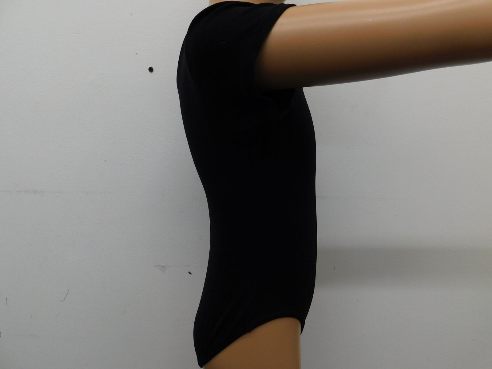 Features: Short Sleeve Nylon Plain black short sleeve leotard.