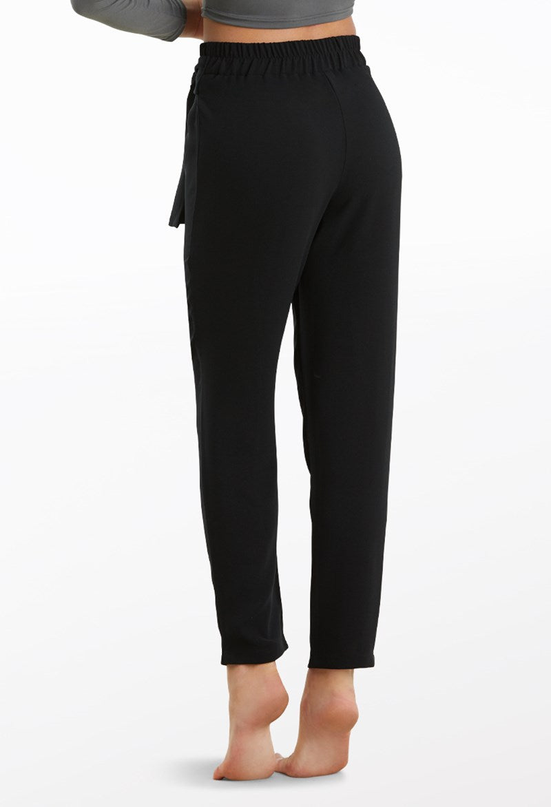 Woven crepe pants have an elastic waistband and adjustable tie waist