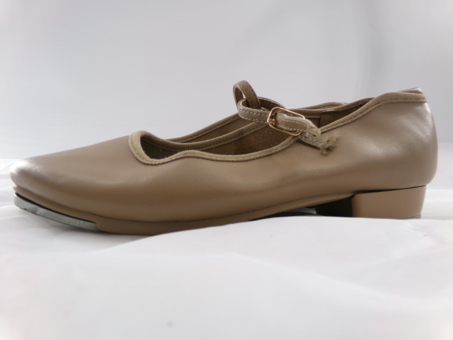 Man made uppers and sole with single strap buckle. Custioned heel counter and sock liner. Nonskid traction pad. Star Tone toe and heel taps are secured with resonating boards. Heel graduates from 1/2" in child to 1" in adults.