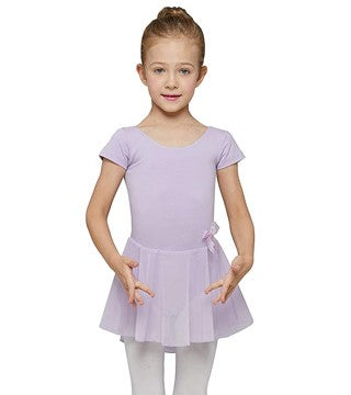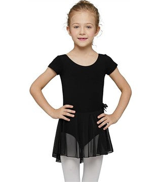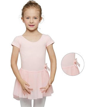 Cotton basic short sleeve leotard with attached skirt and bow accent on the hip