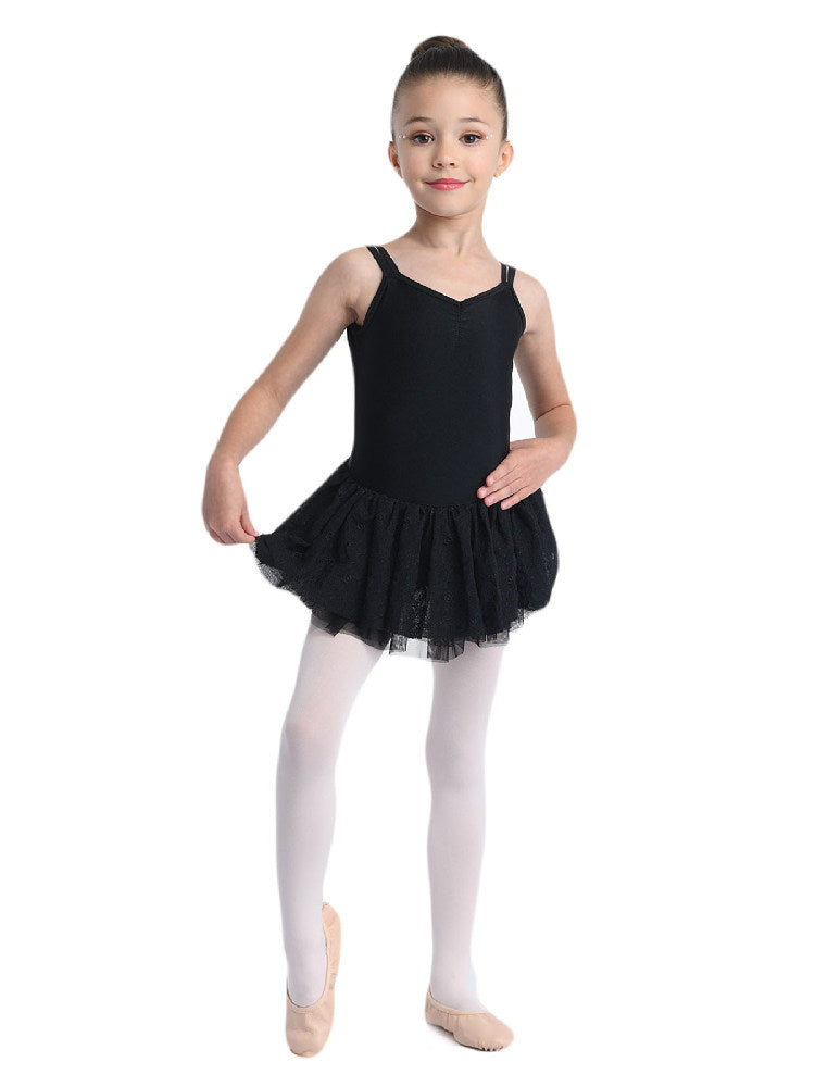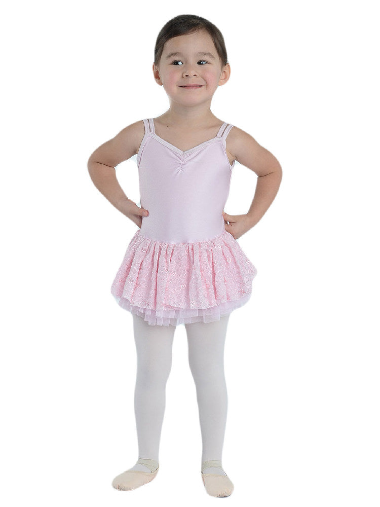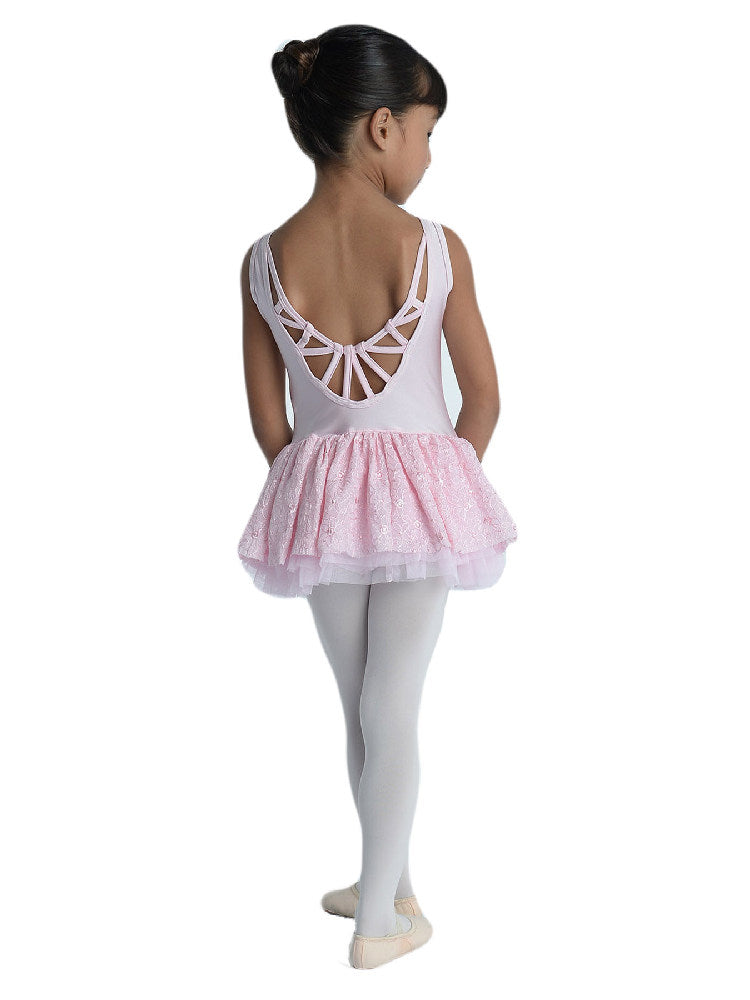 Double strap camisole dress with macrame' back detail. Attached floral embroidered triple layer skirt. Fully front lined.
